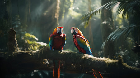 An AI-generated illustration of colorful parrots perched on a tree branch in a jungle setting.