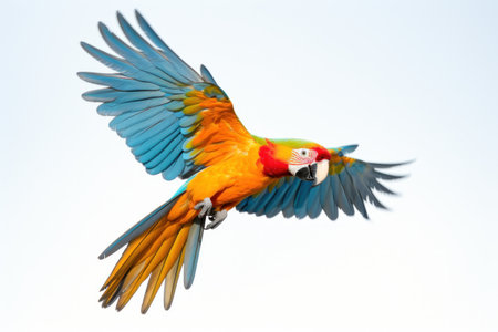 A scarlet macaws (Ara macao) a Bright red vibrant parrot in flight showing off bright blue, red and yellow colors