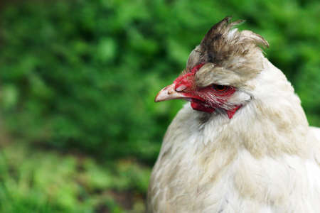White chicken portrait closeup outdoors. Young hen in the village. Concept of farming and rural life