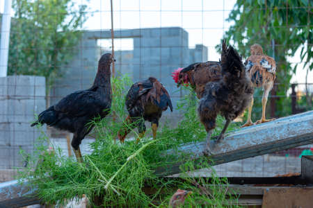 Chickens and roosters on the farm. Industry