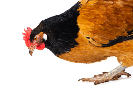 Portrait of a Vorwerk hen isolated on white background, studio shot.