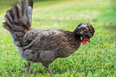 Close up of a Polish bantam chicken walking on the grass