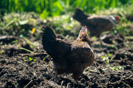 chicken brown with black plumage in green grass