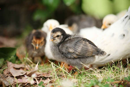 Cute baby chicken with his free range family