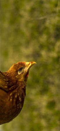 Close up SeBright Chick brown colour in the green garden blur background..
