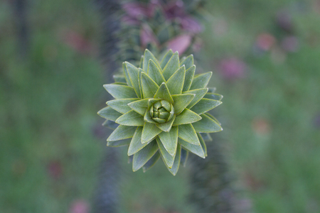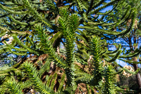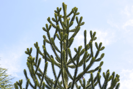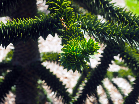 Exotic monkey puzzle tree with spiral sharp leaves and prickly canopy
