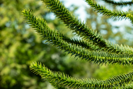 Close-up of vibrant green Araucaria tree branches with sharp, spiky leaves in outdoor. Natural texture and unique details of foliage. Blurred background.