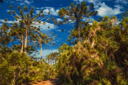 Dirt pathway in a forest with pine trees at Aparados da Serra National Park, near Cambara do Sul. A small country town in southern Brazil with amazing natural tourist attractions. Oil Paint filter.