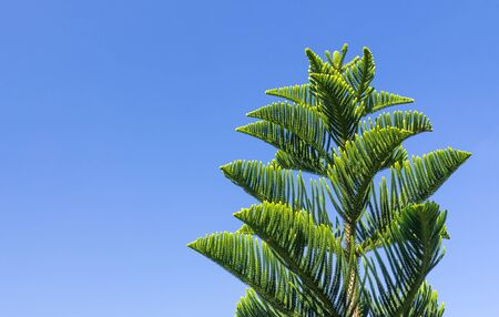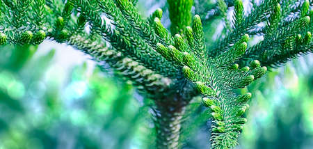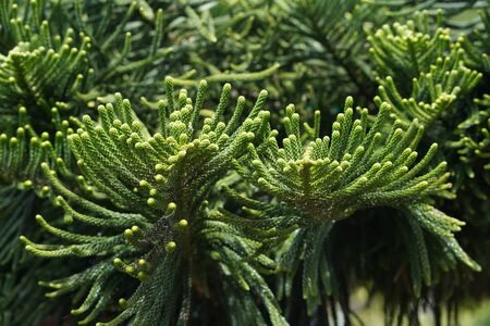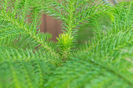 Top view of green Norfolk Island Pine, Green tree branch, Selective focus of young Pine plant.