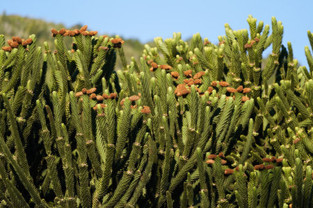 Lush green Norfolk Island pine branches create a vibrant, textured botanical background.