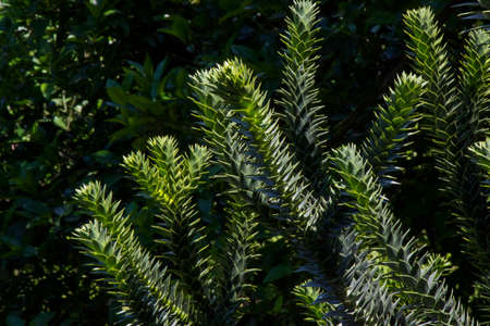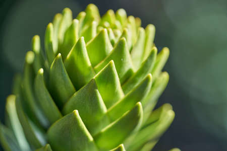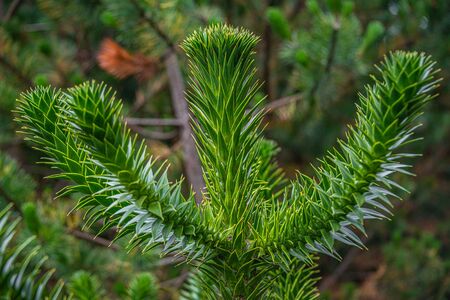Araucaria araucana branch with green lakes. Macro photo of sharp leaves.