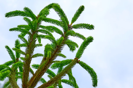 Closeup of Nolfolk island pine leaves on sky