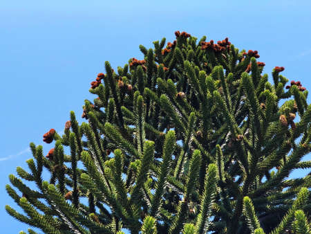 big monkey puzzle tree against blue sky, in latin Araucaria araucana