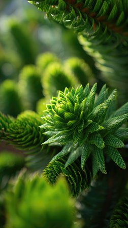 The Monkey puzzle tree in spring, fresh green leaves, soft sunlight filtering, vibrant atmosphere full of vitality, natural textures, serene mood P.