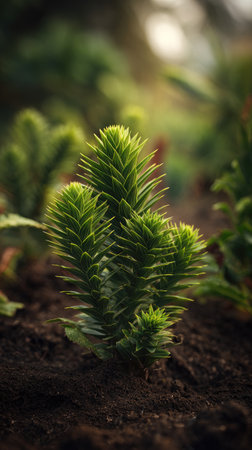 Araucaria with small fresh leaves, growing upright in fertile soil, sunlight filtering gently, realistic textures, vibrant green tones, natural photography style, wide balanced composition