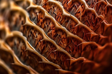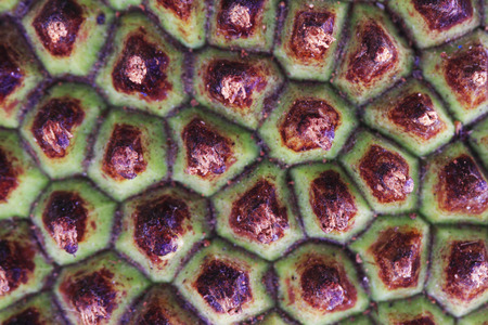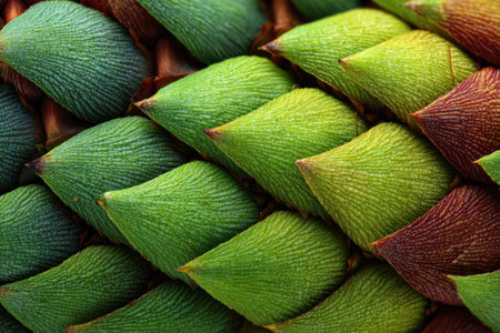 In this close-up view, the intricate patterns of pineapple skin reveal a blend of vibrant greens, earthy browns, and unique textures. Nature showcases its artistry in this abstract close-up.