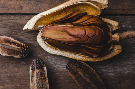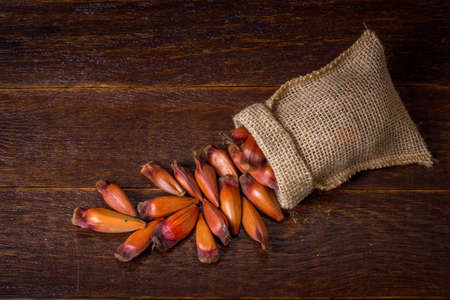 pine nut seed on rustic wooden table. Brazilian cuisine, consumed in winter and June parties.