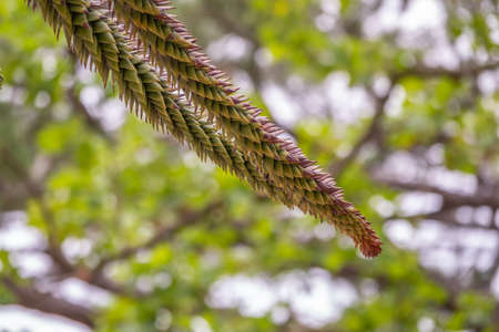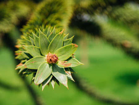 Needles of evergreen tree Araucaria araucana, commonly called the Monkey Puzzle Tree, Monkey Tail Tree, Pewen or Chilean Pine