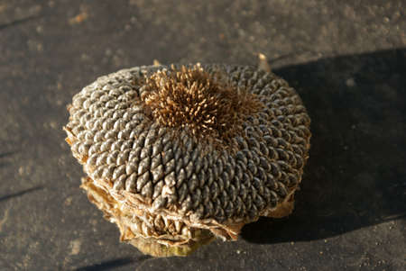 A heap in the form of a slide made of pine nuts from Siberia. On a dark gray table, behind a blurred wood background.
