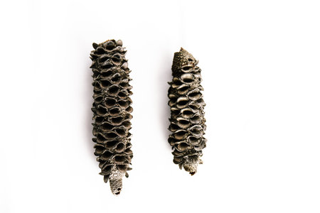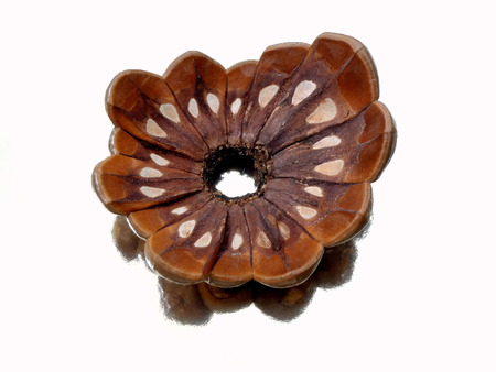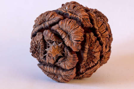 ornamental pine cone, has red seeds inside and is in front of a white background.