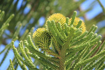 Lush green Norfolk Island pine branches create a vibrant, textured botanical background.