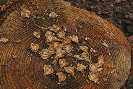 Tree stump with pine cone scraps on top left by a squirrel, pinecone pieces after squirrels feed in the forest