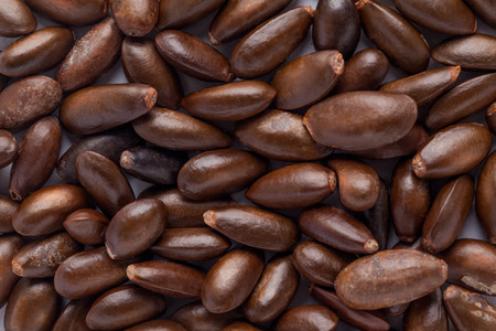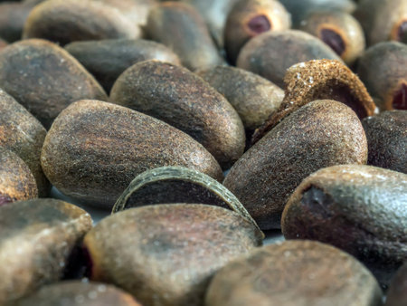 Background of pine nuts in the shell. selective focus. Close up, macro photography.