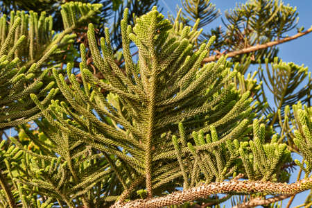 View of the branch of araukaria heterophylla, exotic tree. Commonly known as pine. Folegandros Island, Greece.