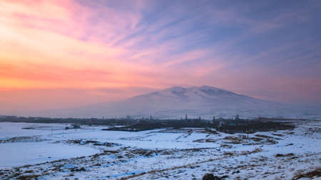 Mountain landscape with snow capped peaks at sunset. Caucasus, Russia