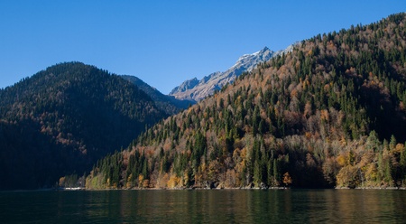 Lake in the mountain forest in autumn. Mountain lake water. Mountain lake in autumn landscape. Lake in mountains