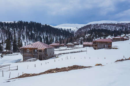 Bakhmaro in winter, Guria, Georgia. White nature of resort Bakhmaro in country Georgia. Snowy colorful wood houses