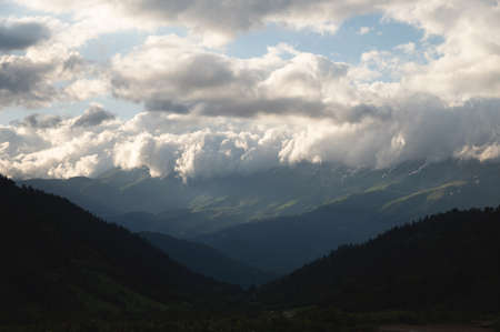 Mountain forest gorge landscape, clouds cling to the tops of high mountains, a glimpse of the suns rays