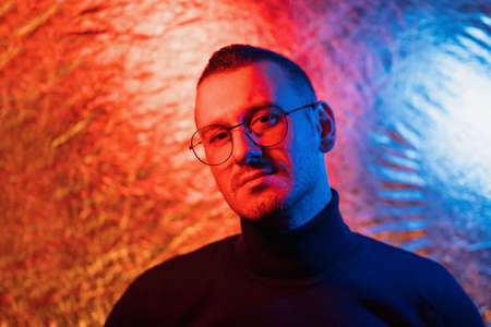 Neon portrait of serious man wearing glasses with black frame and dark turtleneck sweater on cosmic silver multicolored background