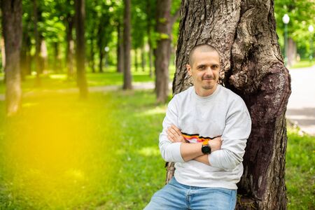 portrait of a Handsome young strong sports man posing outdoors at the nature park location