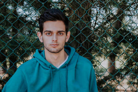 Lifestyle portrait of a young Caucasian man in casual wear on a blurred background of the urban environment.