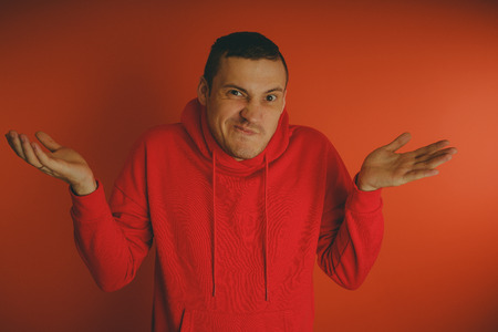 Crazy and charismatic guy posing on orange background. A man in a red tracksuit.