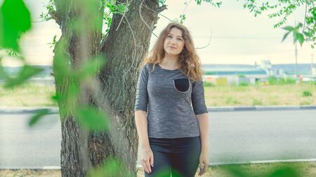 Closeup portrait of attractive girl in casual clothes on green forest background looking into camera with serious face. Pretty tourist girl in gray sweater posing on blurred forest background.