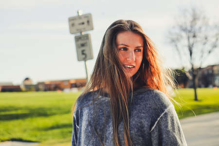 Close-up portrait of smiling woman wearing gray sweatshirt outdoors