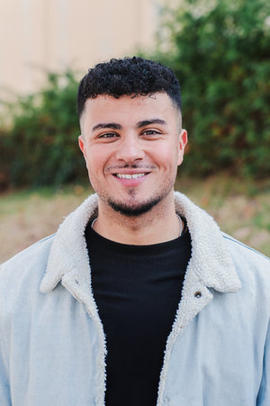 A close-up portrait of a young man with curly hair and a warm smile, set against a calming blue backdrop. His expressive eyes and friendly demeanor radiate positivity and approachability, inviting connection and warmth.