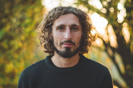 Portrait of a handsome curly-haired guy on the nature. Stylish young guy outdoors.