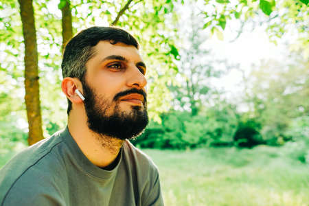Portrait of young caucasian peaceful bearded man in earphones outdoors, relaxing at the park.