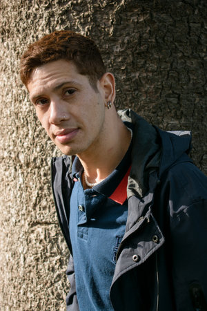 waist up portrait of young redhead latino ethnicity Paraguayan man, outdoors in blue jacket, at sunset leaning on tree looking at camera, lifestyles concept