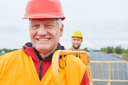 Smiling construction worker and colleague carry barriers for road construction safety