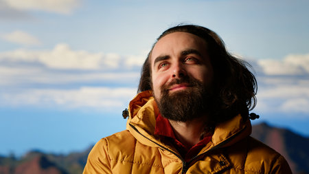 Smiling bearded man in a beanie enjoying the forest nature, contemplating life, seeking mindfulness, escape from the city, digital detox, and stress relief
