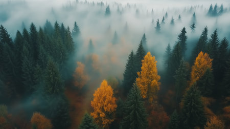 Misty autumn forest with colorful trees in a serene landscape during early morning hours