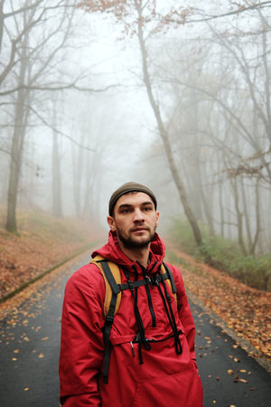 Portrait of male traveler in red jacket standing on forest path in autumn fog. Calm mood and natural harmony