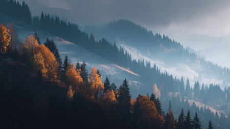 This captivating landscape showcases misty mountains and vibrant autumn foliage, creating a serene atmosphere. Perfect for nature lovers and travel enthusiasts alike.
