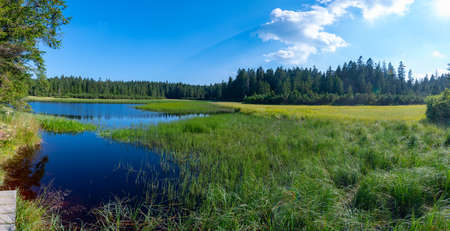 Beautiful lake Kleiner Arbersee with its swimming islands in the Bavarian Forest, Upper Palatinate, Bavaria, Germany.