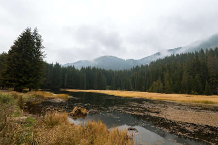 Mountain lake in a misty morning, Carpathians, Ukraine