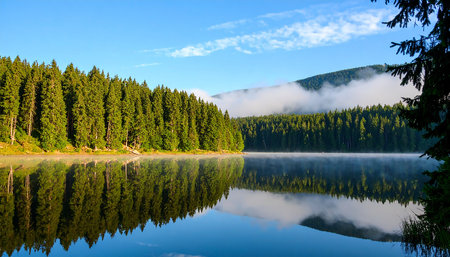 A calm lake reflects the surrounding evergreen forest on a clear day. The scene is enveloped in soft mist, creating a serene and peaceful atmosphere. The composition features lush trees and gentle lighting. Suitable for environmental or travel-related visual content.